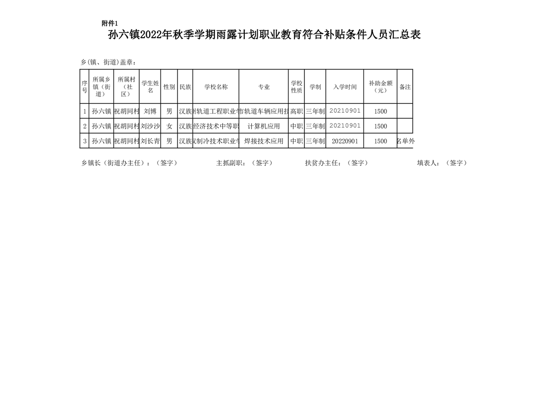 祝胡洞村2022年秋季学期雨露计划职业教育符合补贴条件人员名单