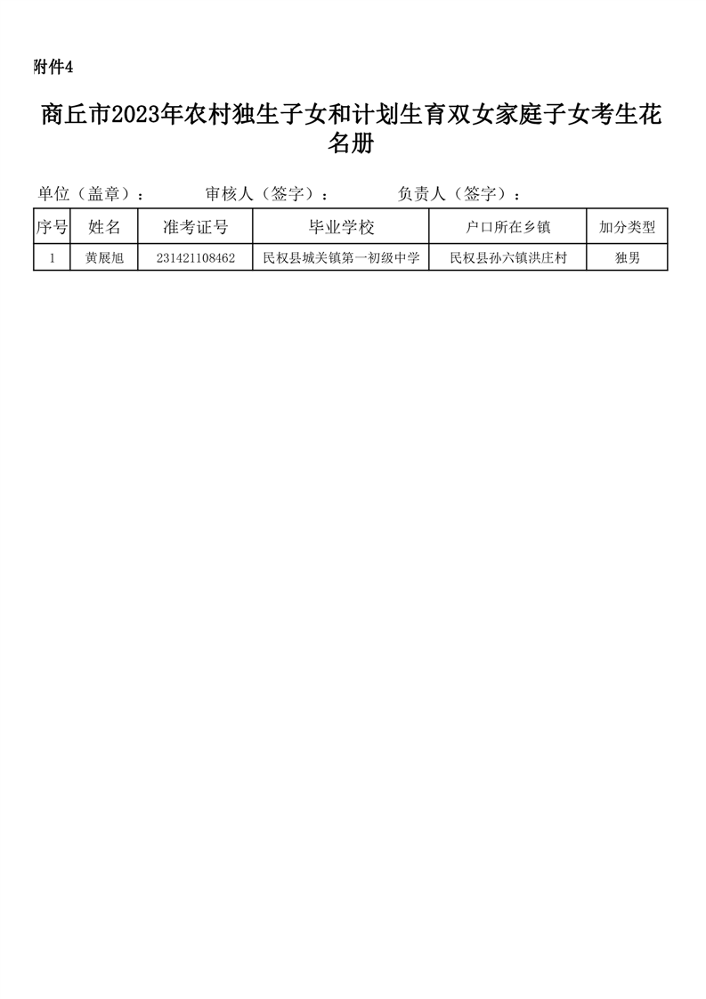 洪庄村2023年农村独生子女和计划生育双女家庭子女考生花名册