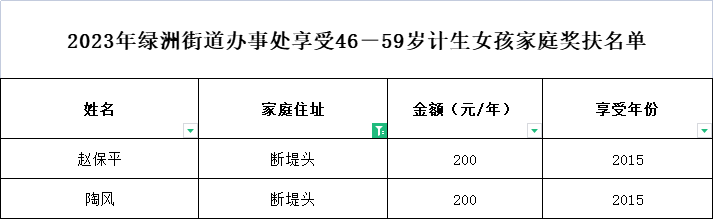 2023年绿洲街道办事处享受46-59岁计生女孩家庭奖扶名单