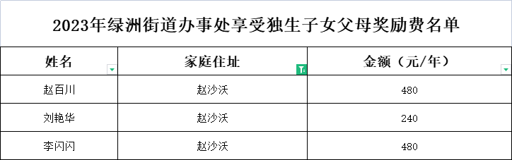 2023年绿洲街道办事处享受独生子女父母奖励费名单