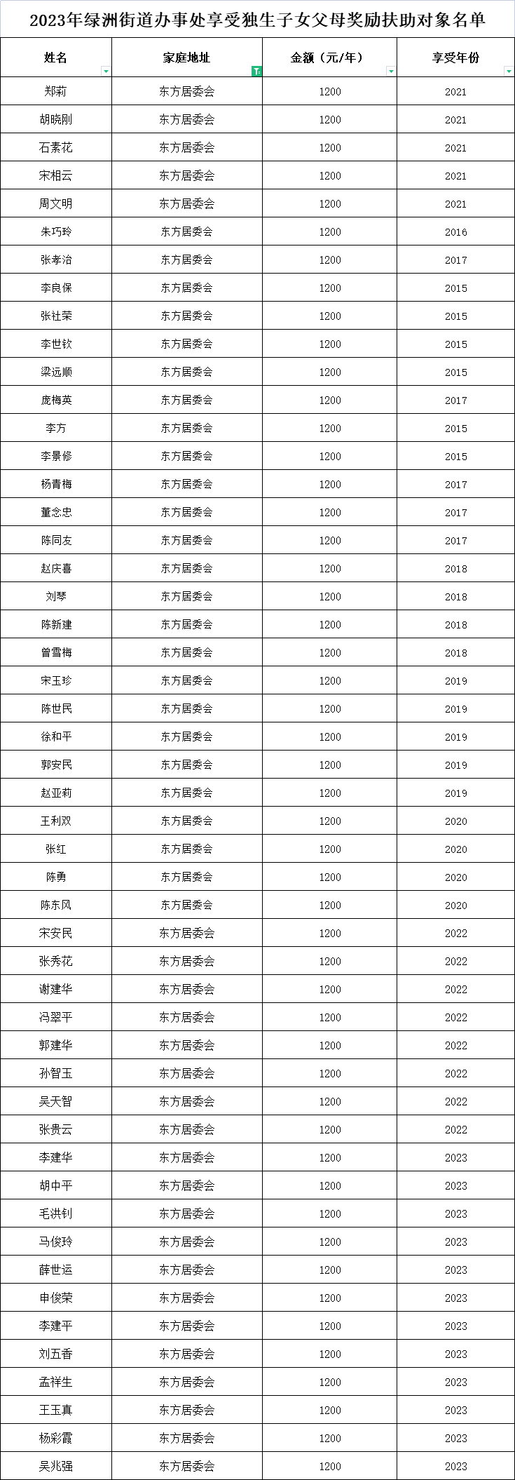 2023年绿洲街道办事处享受独生子女父母奖励扶助对象名单