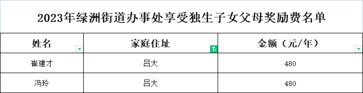 2023年绿洲街道办事处享受独生子女父母奖励费名单