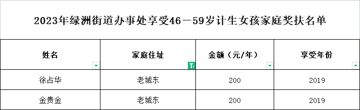 2023年绿洲街道办事处享受46-59岁计生女孩家庭奖扶名单