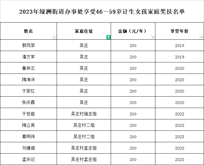2023年绿洲街道办事处享受46-59岁计生女孩家庭奖扶名单