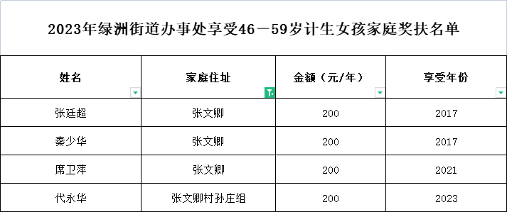 2023年绿洲街道办事处享受46-59岁计生女孩家庭奖扶名单