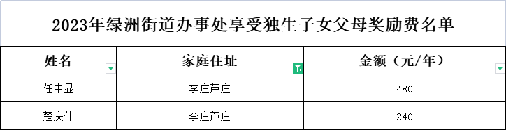 2023年绿洲街道办事处享受独生子女父母奖励费名单