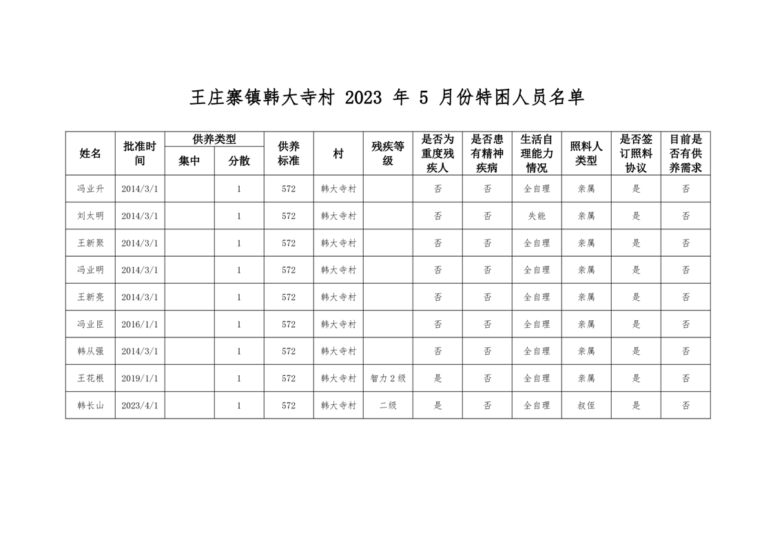 王庄寨镇韩大寺村2023年5月份特困人员名单