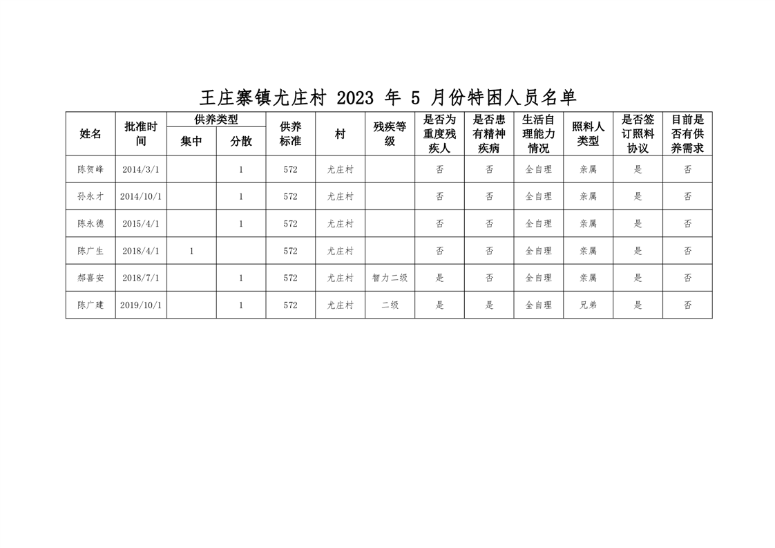 王庄寨镇尤庄村2023年5月份特困人员名单