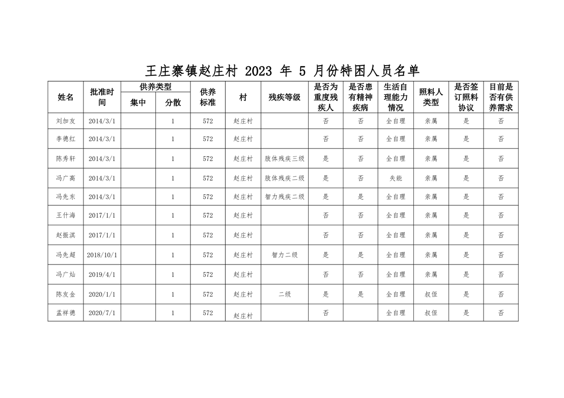 王庄寨镇赵庄村2023年5月份特困人员名单