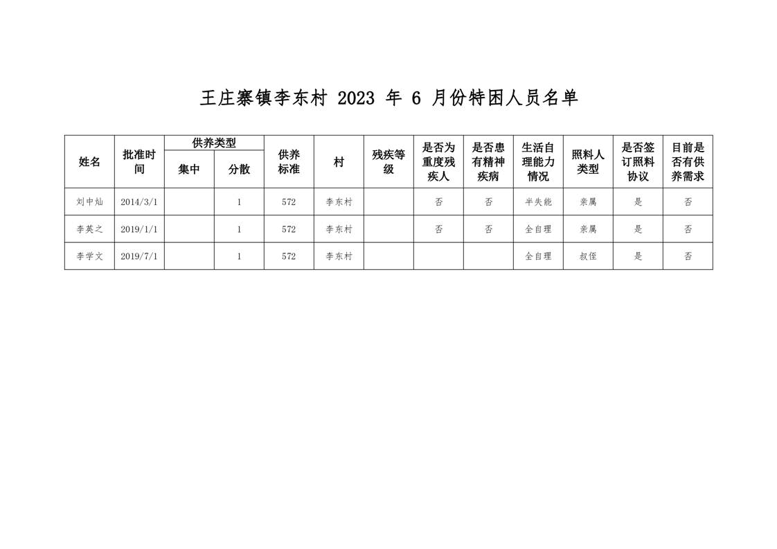 王庄寨镇李东村2023年6月份特困人员名单