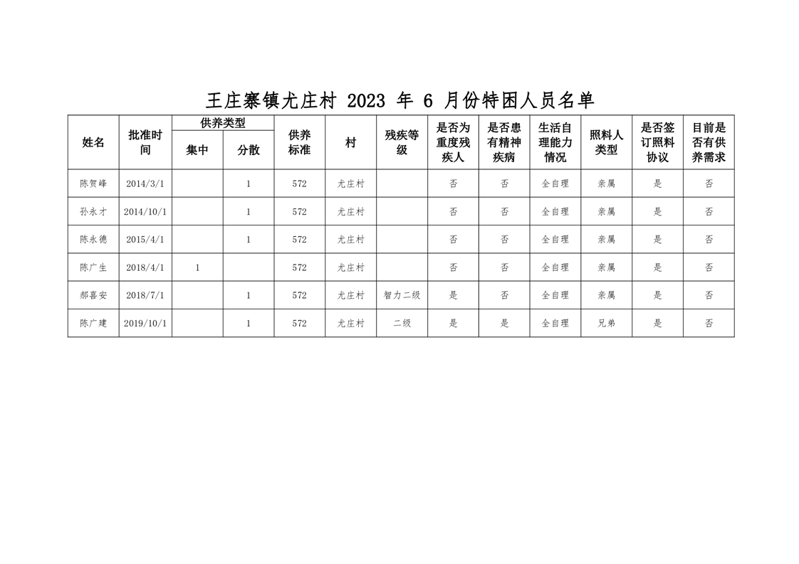 王庄寨镇尤庄村2023年6月份特困人员名单