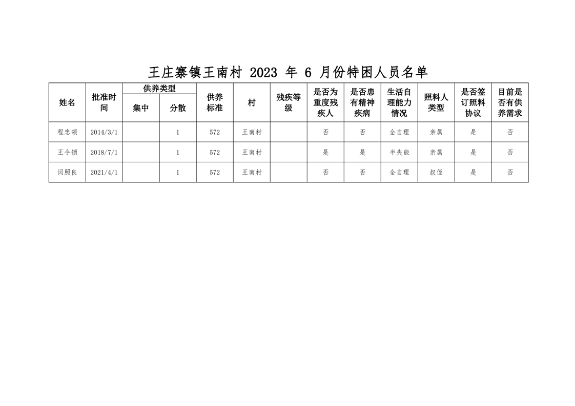 王庄寨镇王南村2023年6月份特困人员名单