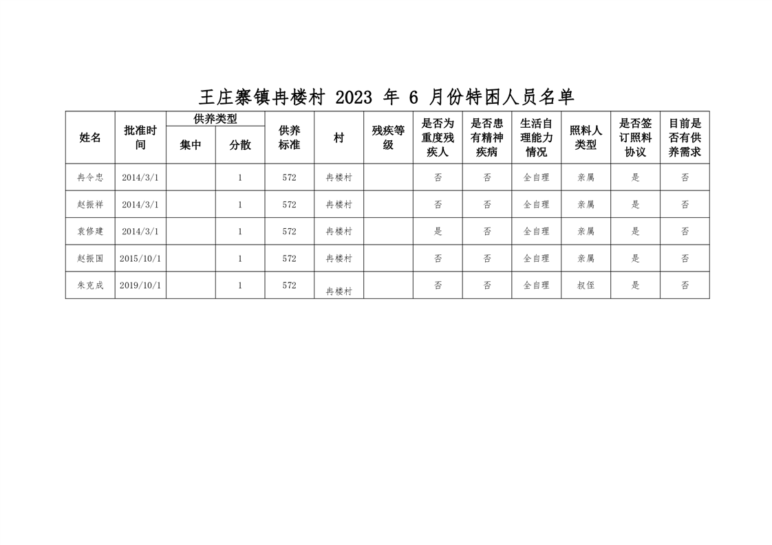 王庄寨镇冉楼村2023年6月份特困人员名单