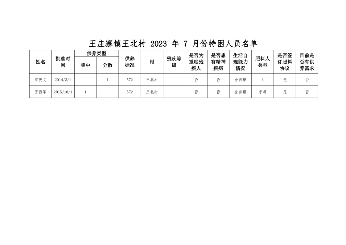 王庄寨镇王北村2023年7月份特困人员名单