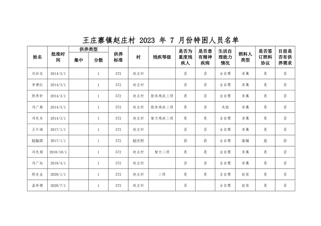 王庄寨镇赵庄村2023年7月份特困人员名单