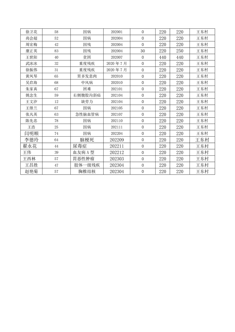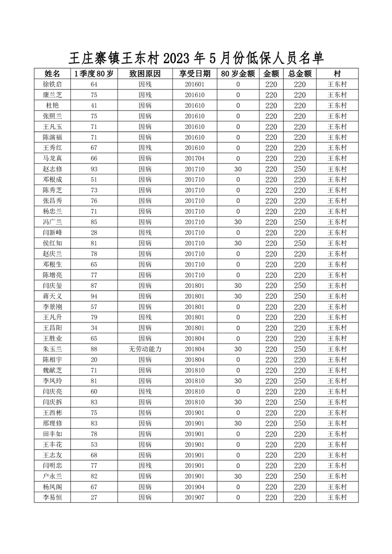 王庄寨镇王东村2023年5月份低保人员名单