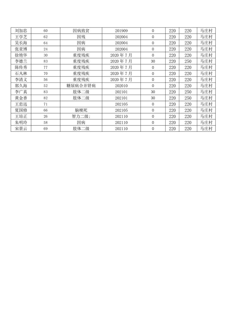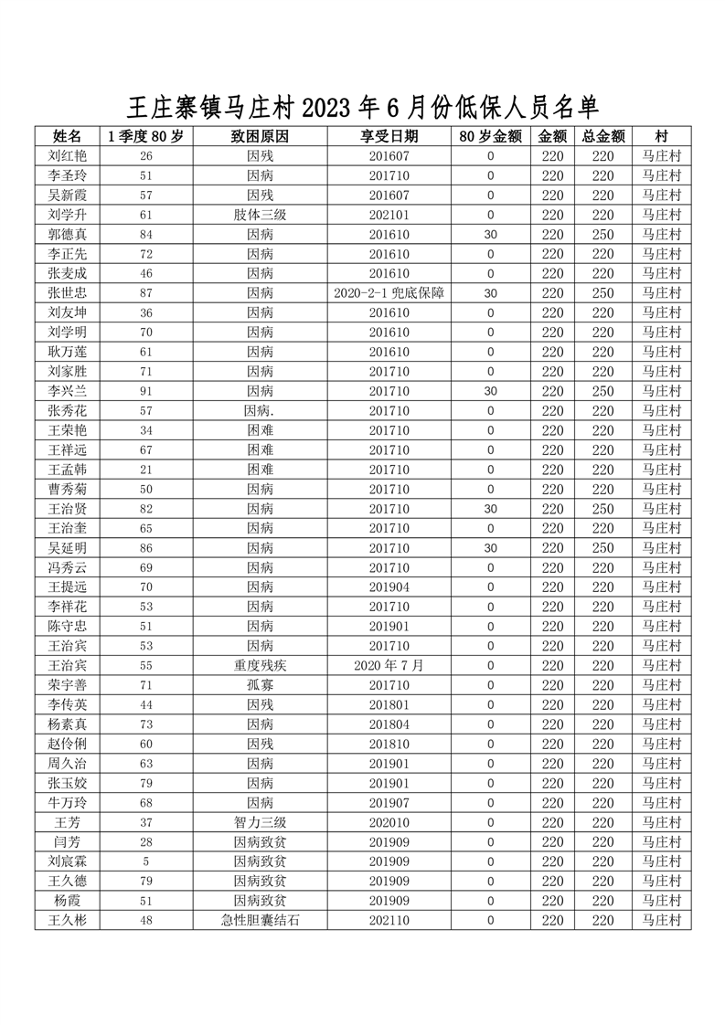 王庄寨镇马庄村2023年6月份低保人员名单