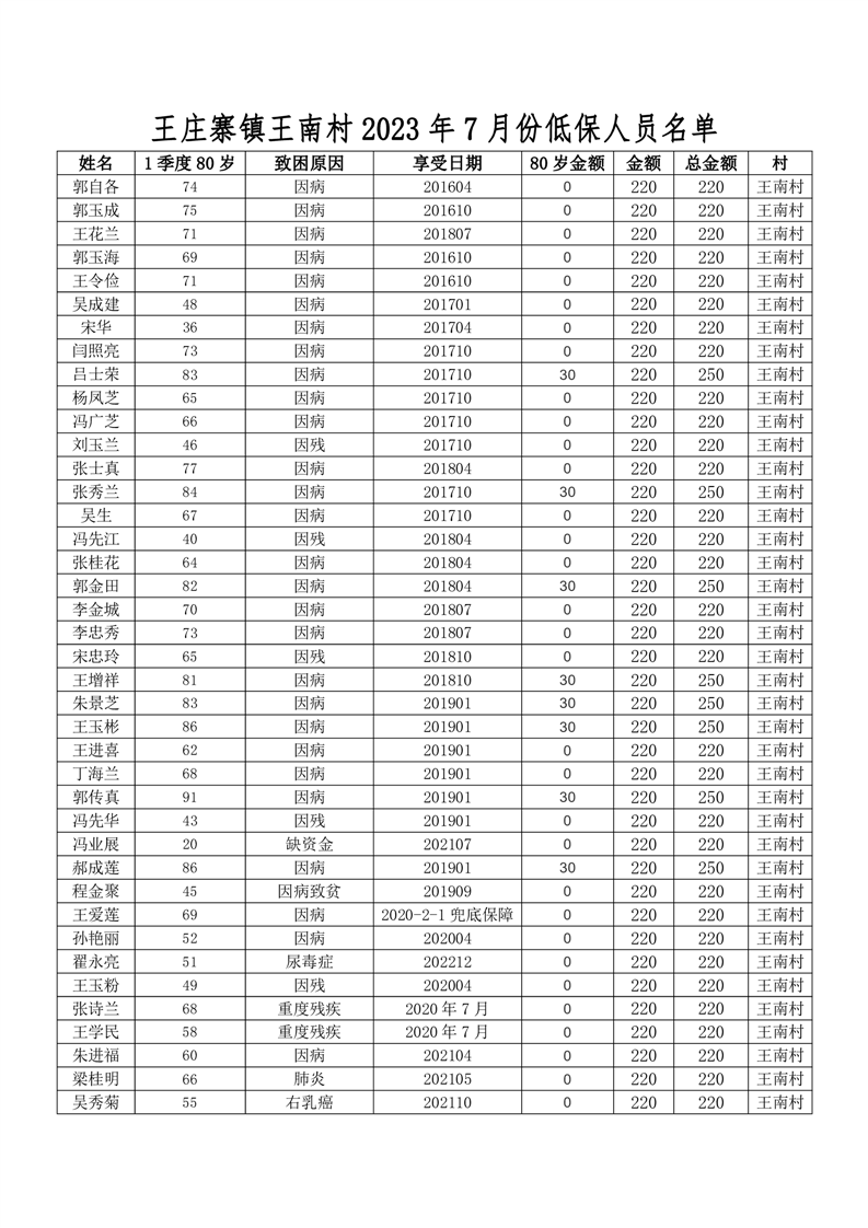 王庄寨镇王南村2023年7月份低保人员名单