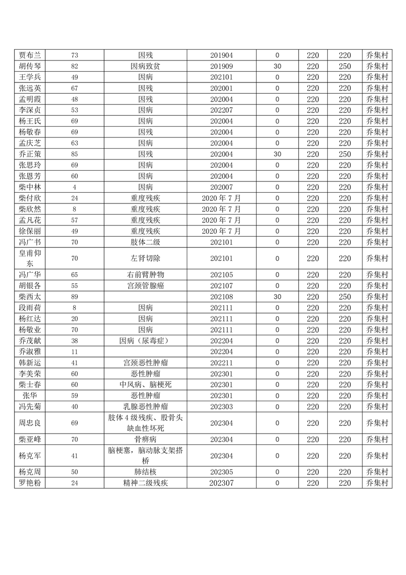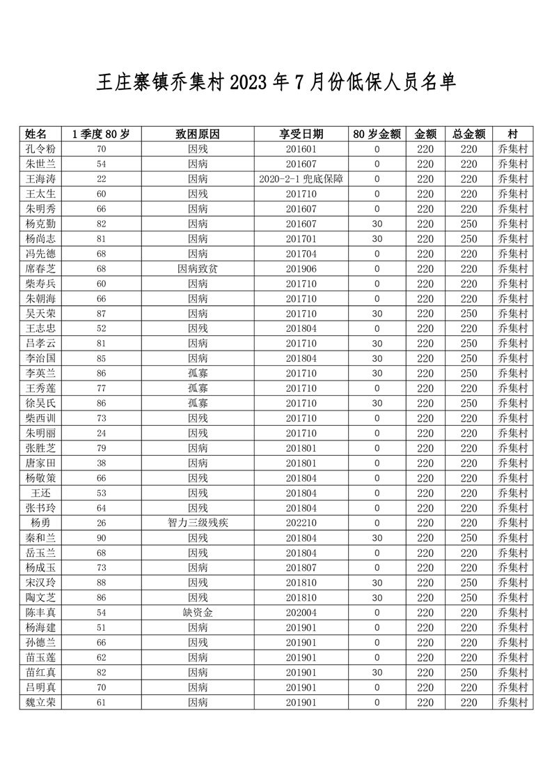 王庄寨镇乔集村2023年7月份低保人员名单
