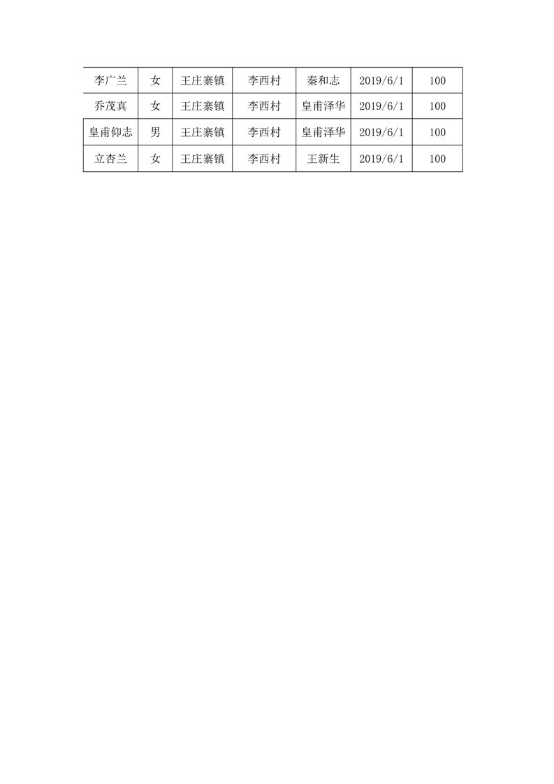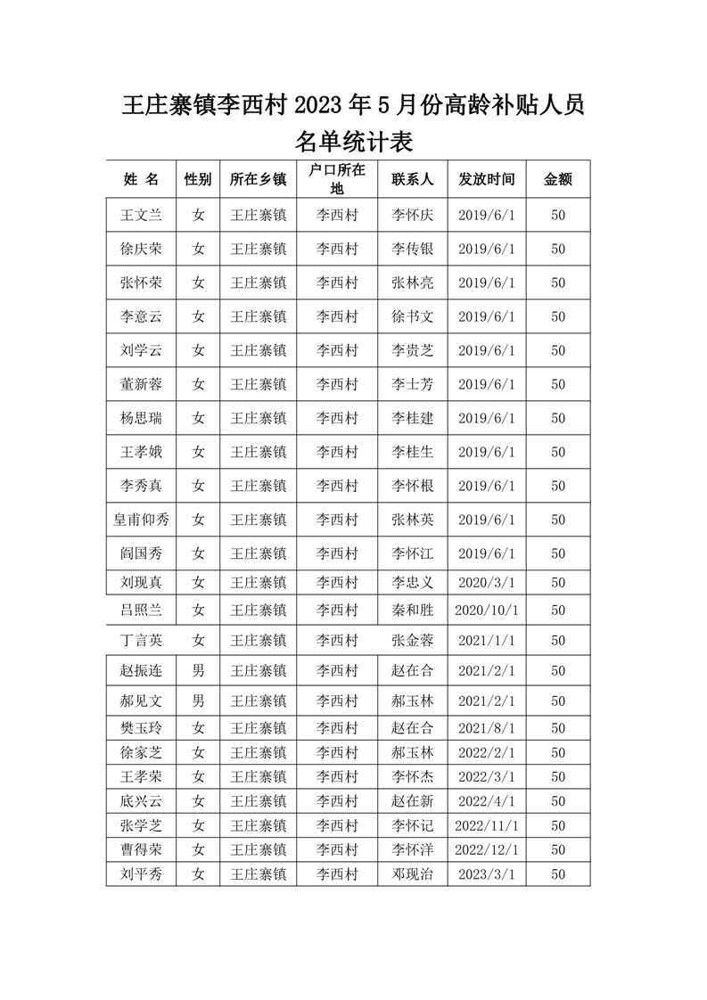 王庄寨镇李西村2023年5月份高龄补贴人员名单统计表