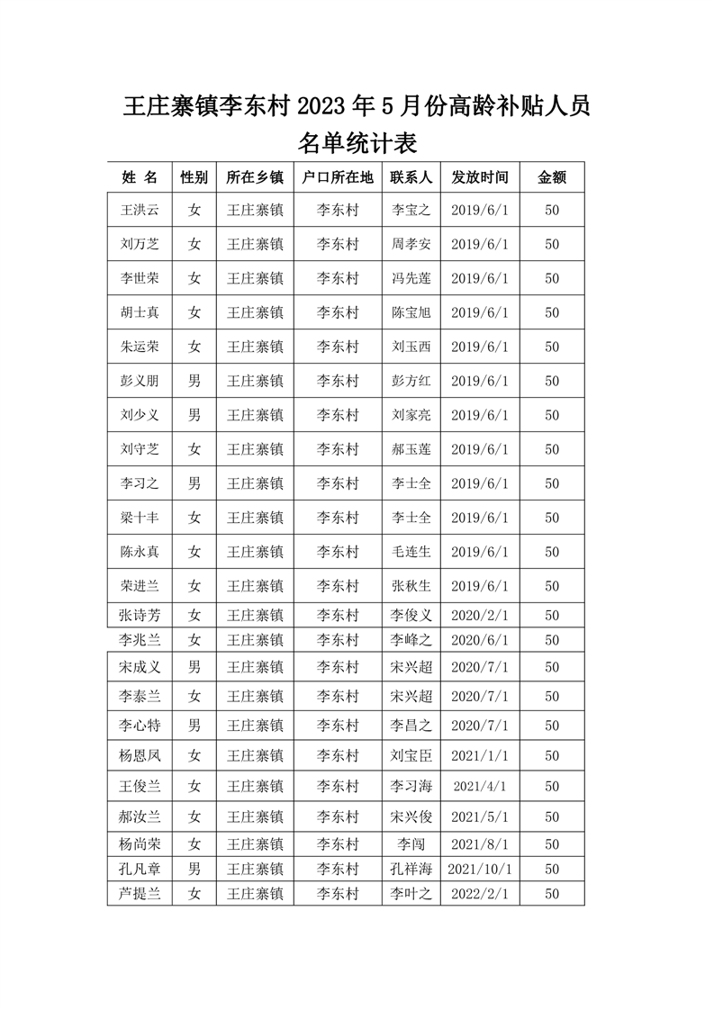 王庄寨镇李东村2023年5月份高龄补贴人员名单统计表