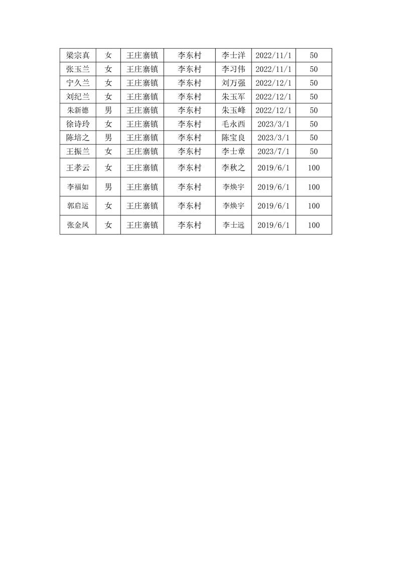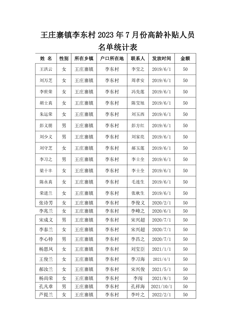 王庄寨镇李东村2023年7月份高龄补贴人员名单统计表