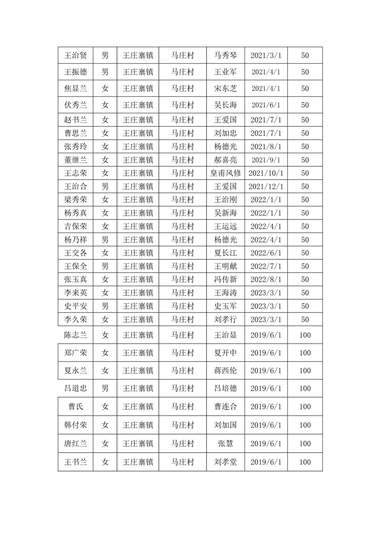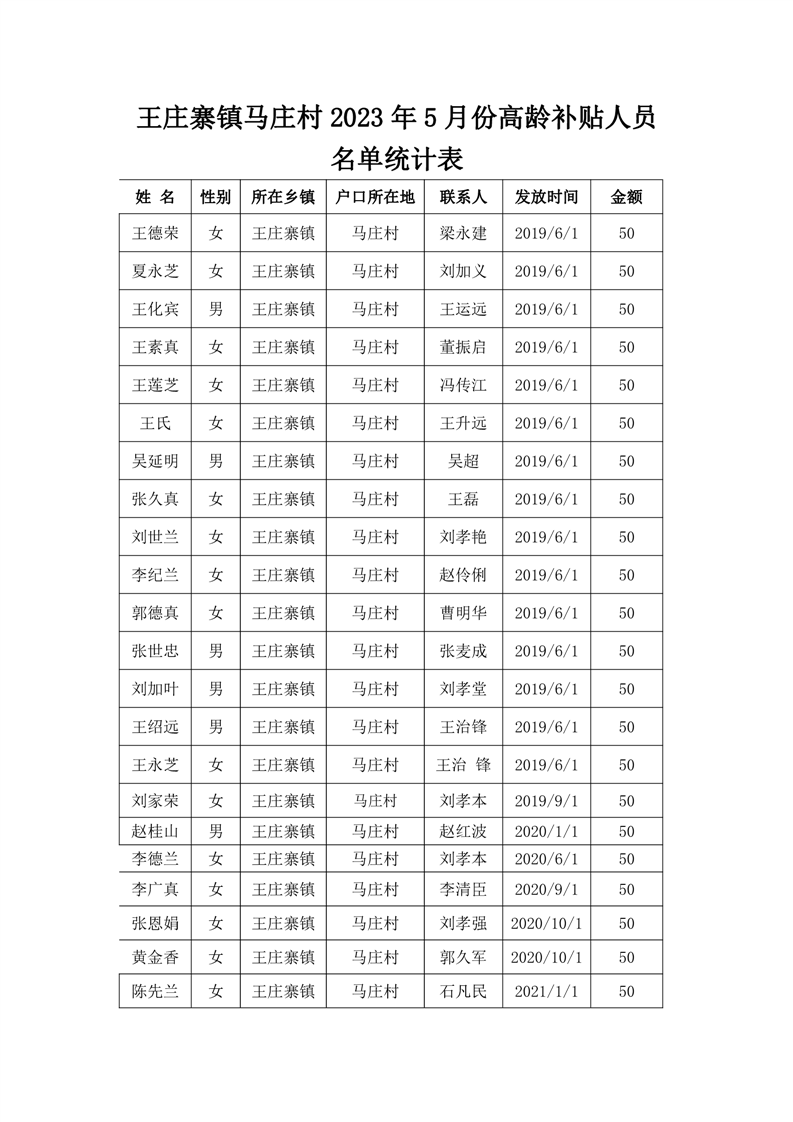 王庄寨镇马庄村2023年5月份高龄补贴人员名单统计表
