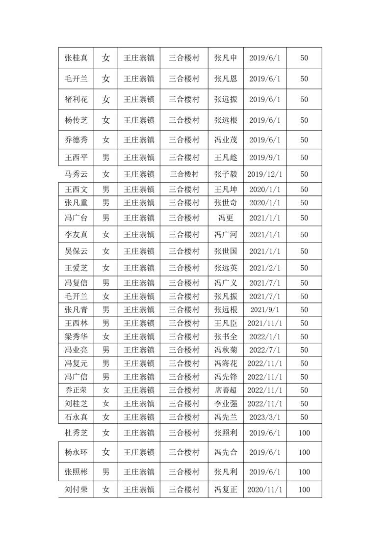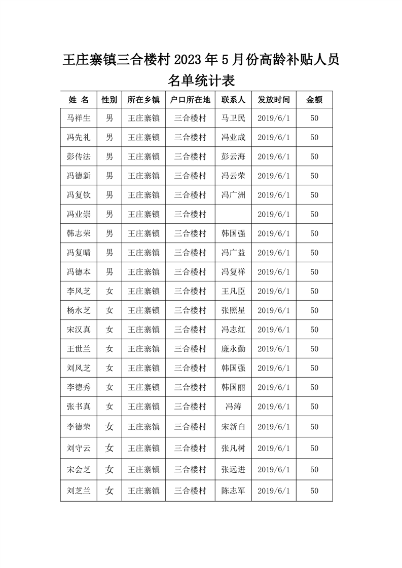 王庄寨镇三合楼村2023年5月份高龄补贴人员名单统计表
