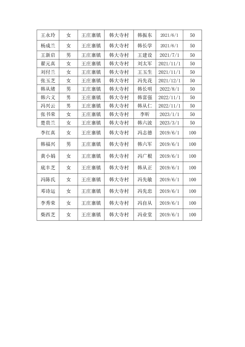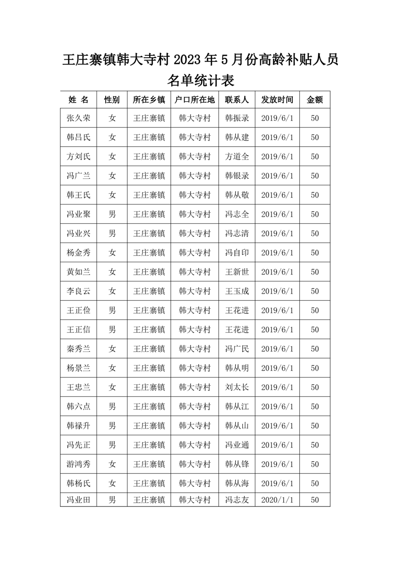 王庄寨镇韩大寺村2023年5月份高龄补贴人员名单统计表