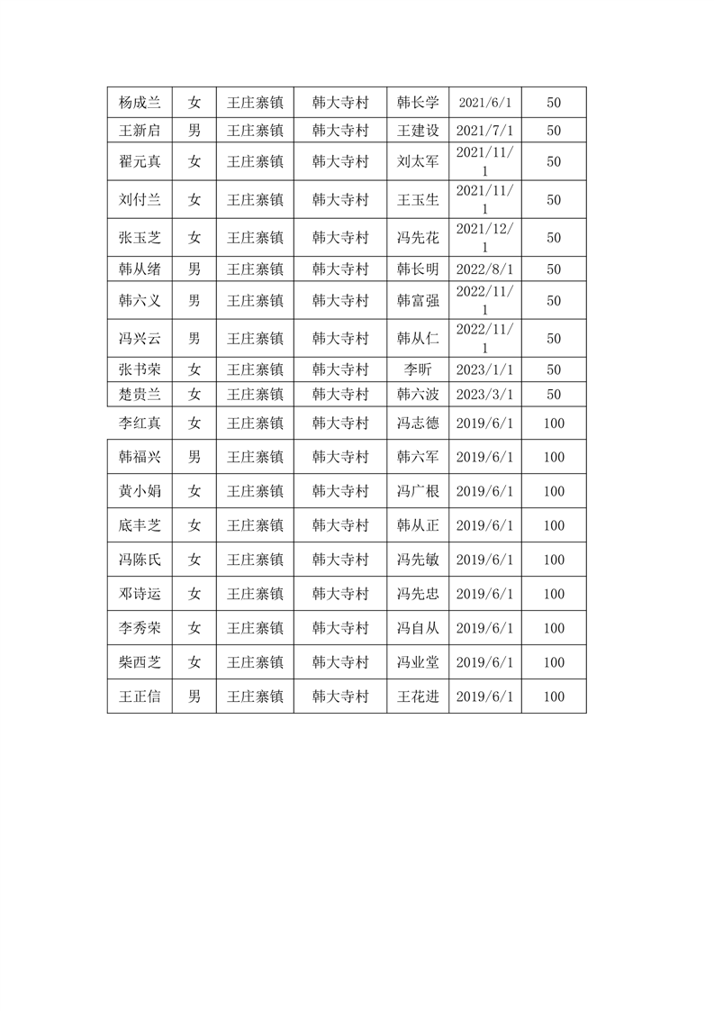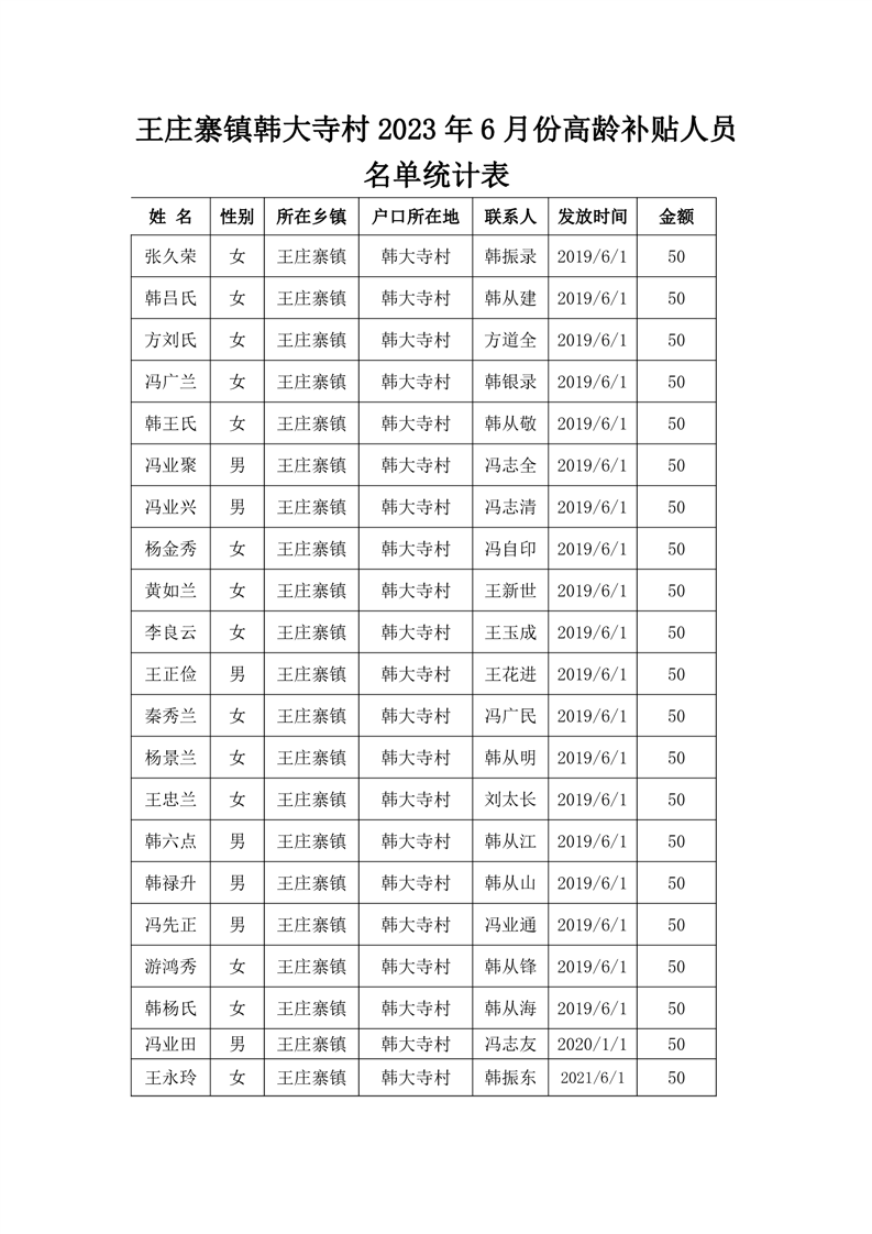王庄寨镇韩大寺村2023年6月份高龄补贴人员名单统计表