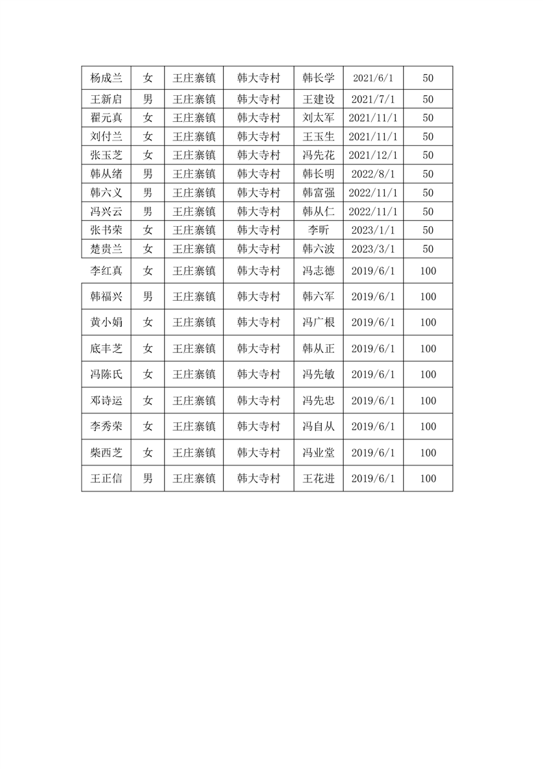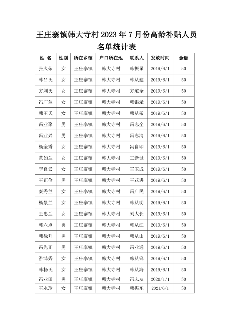 王庄寨镇韩大寺村2023年7月份高龄补贴人员名单统计表
