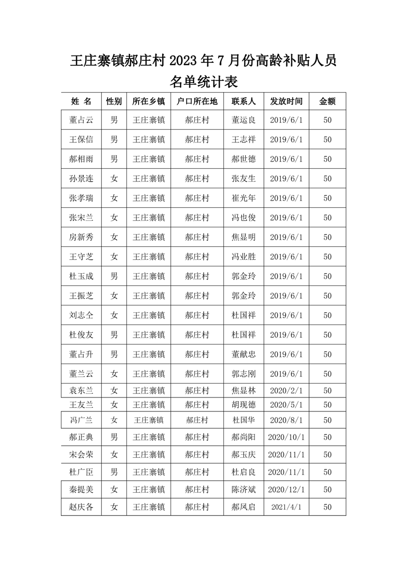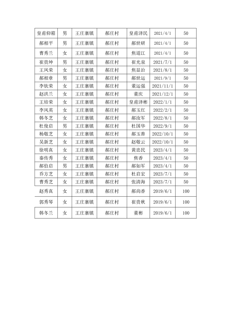 王庄寨镇郝庄村2023年7月份高龄补贴人员名单统计表
