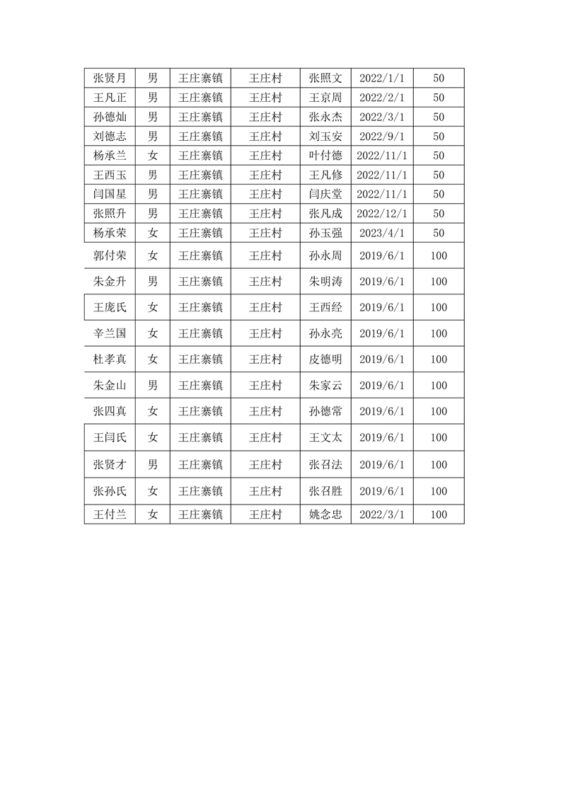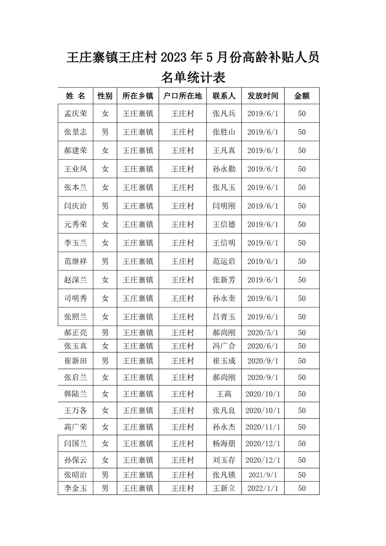 王庄寨镇王庄村2023年5月份高龄补贴人员名单统计表
