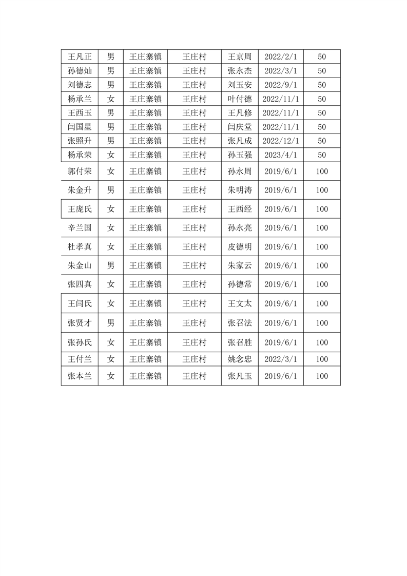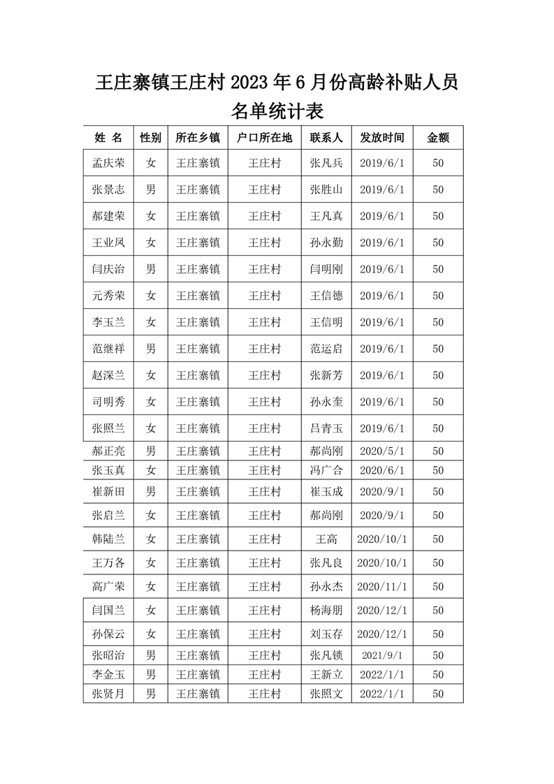 王庄寨镇王庄村2023年6月份高龄补贴人员名单统计表