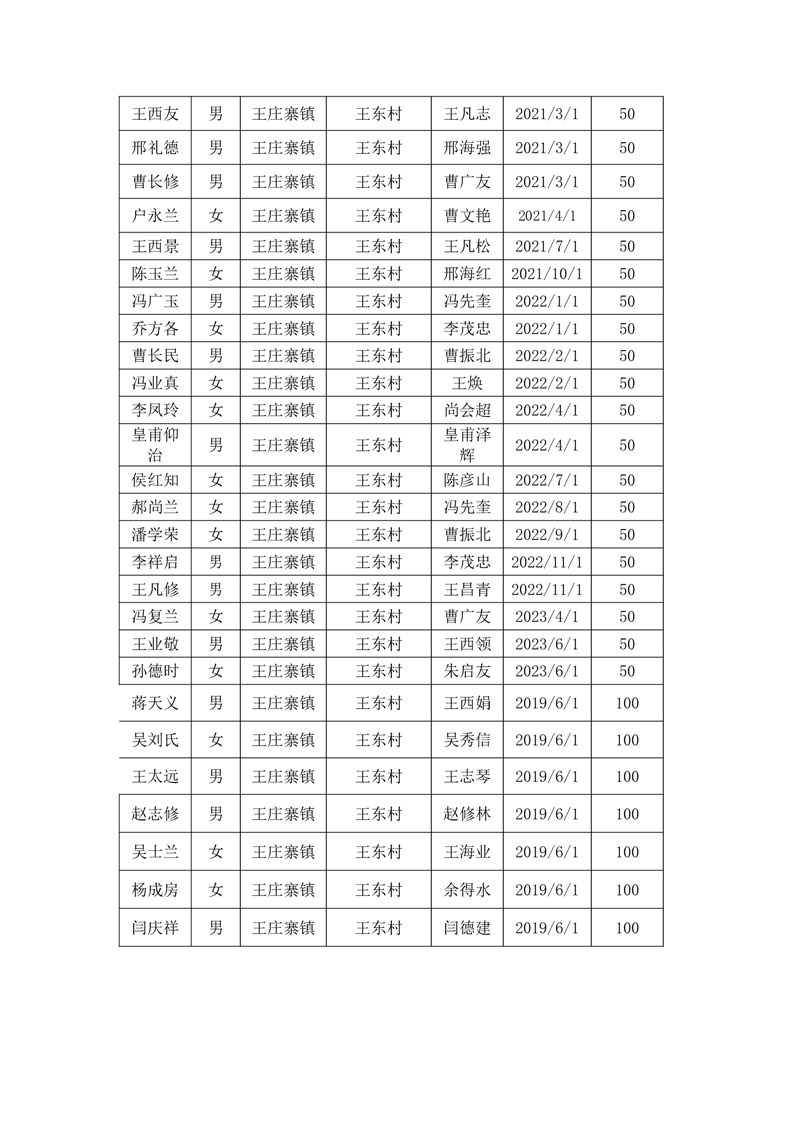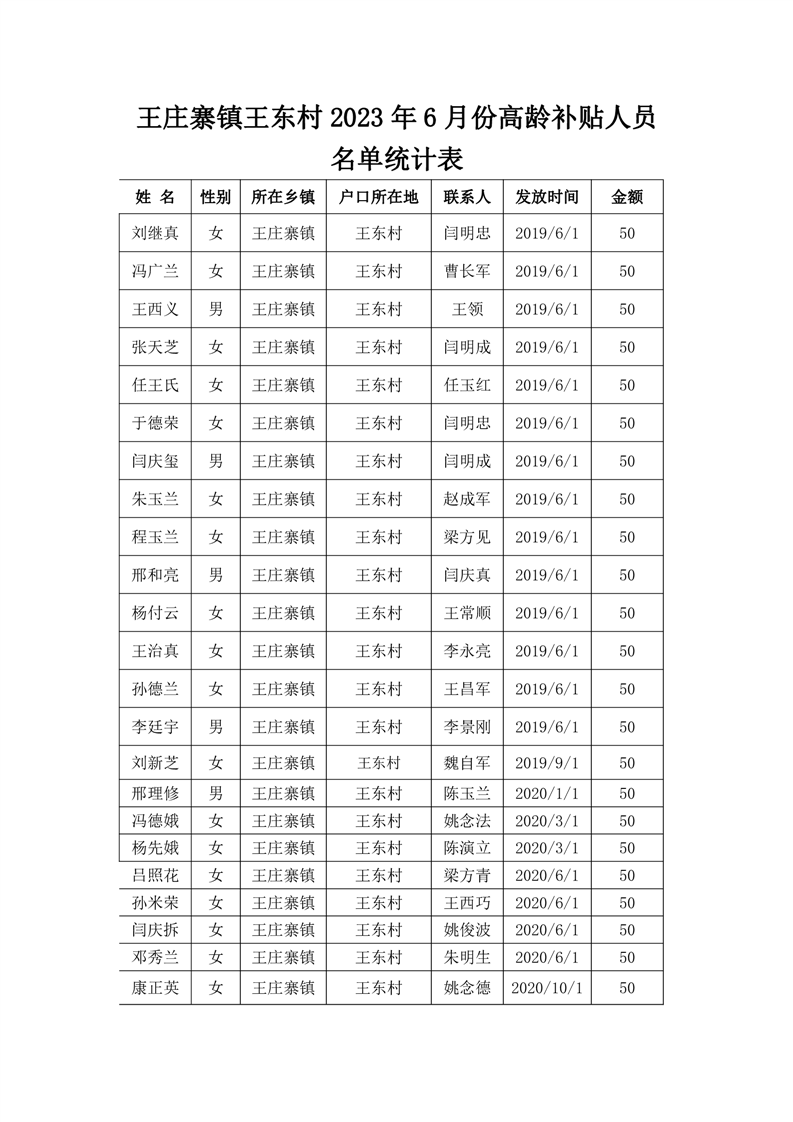 王庄寨镇王东村2023年6月份高龄补贴人员名单统计表