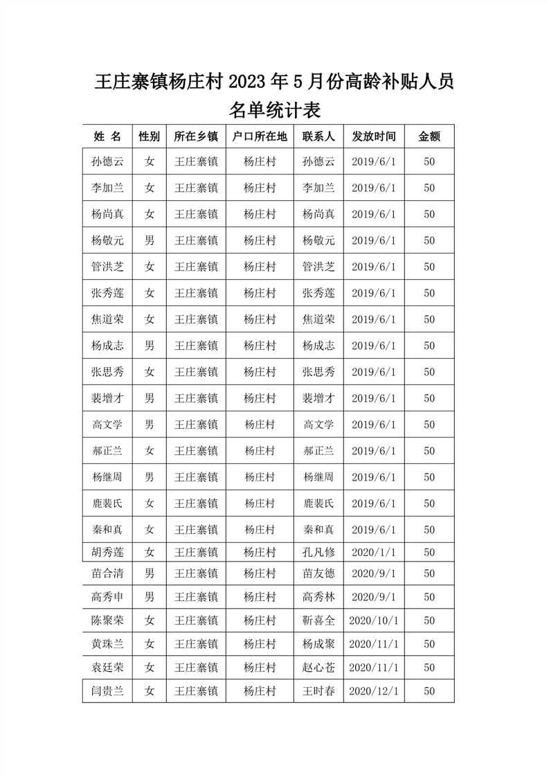 王庄寨镇杨庄村2023年5月份高龄补贴人员名单统计表
