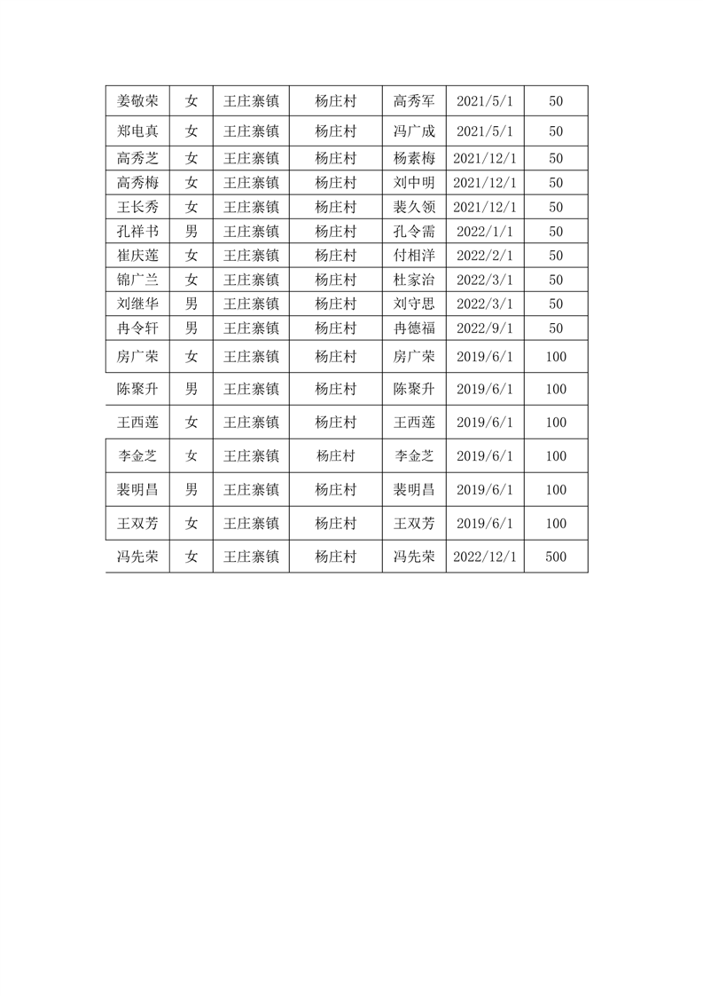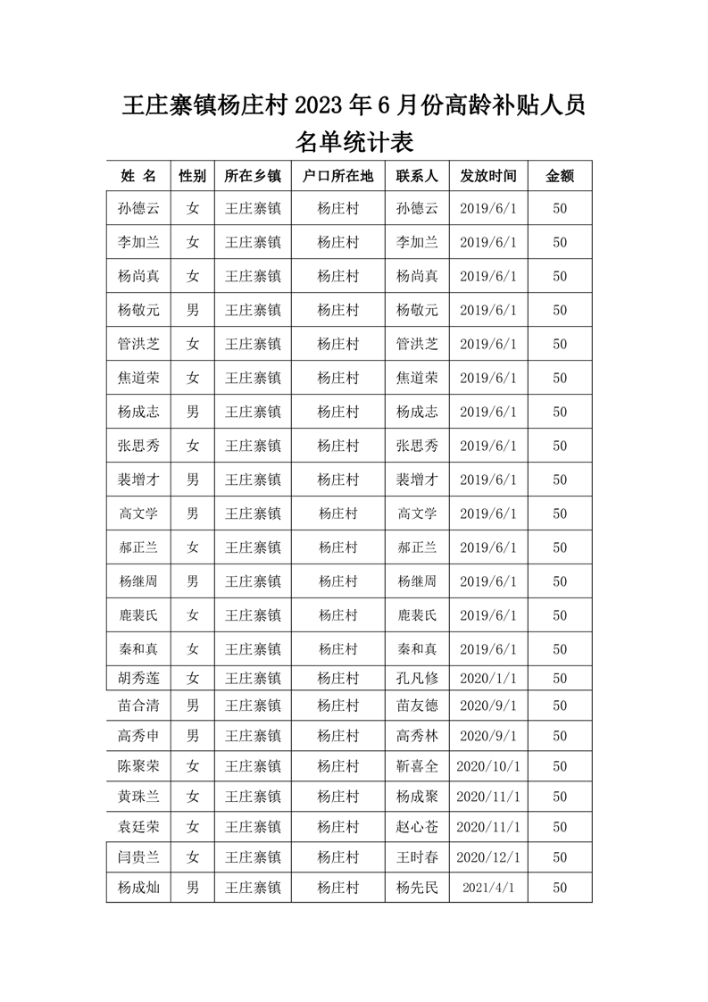 王庄寨镇杨庄村2023年6月份高龄补贴人员名单统计表