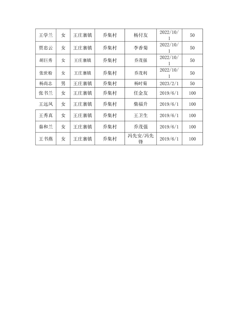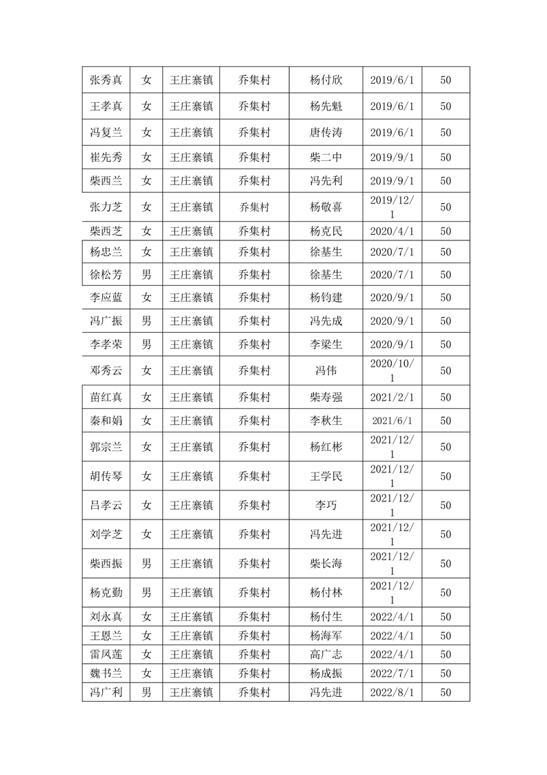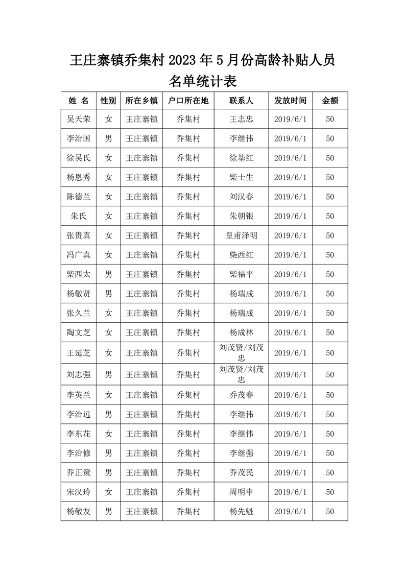 王庄寨镇乔集村2023年5月份高龄补贴人员名单统计表