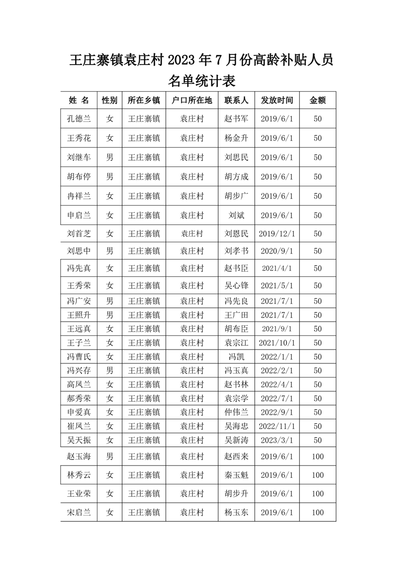 王庄寨镇袁庄村2023年7月份高龄补贴人员名单统计表
