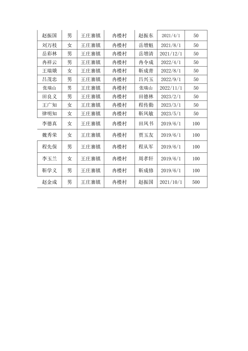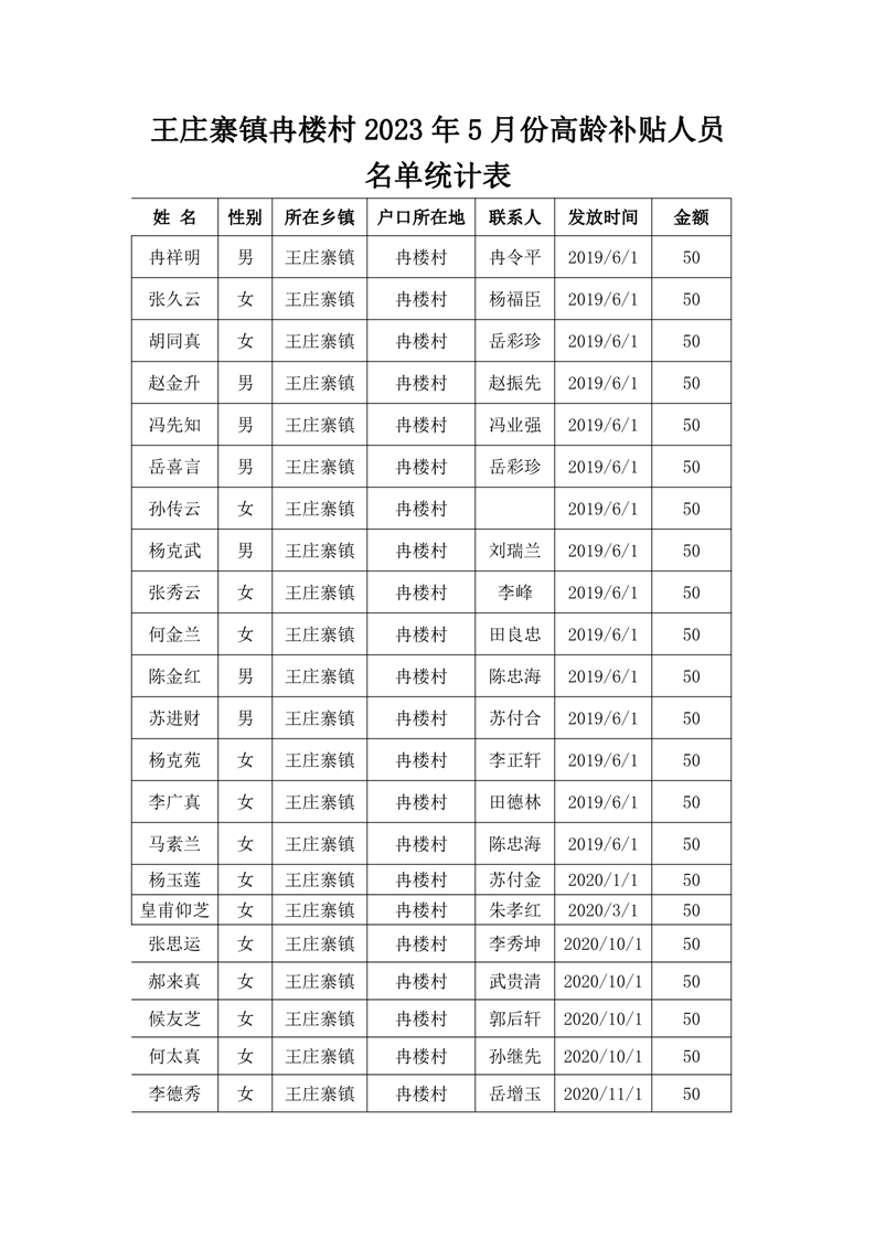 王庄寨镇冉楼村2023年5月份高龄补贴人员名单统计表