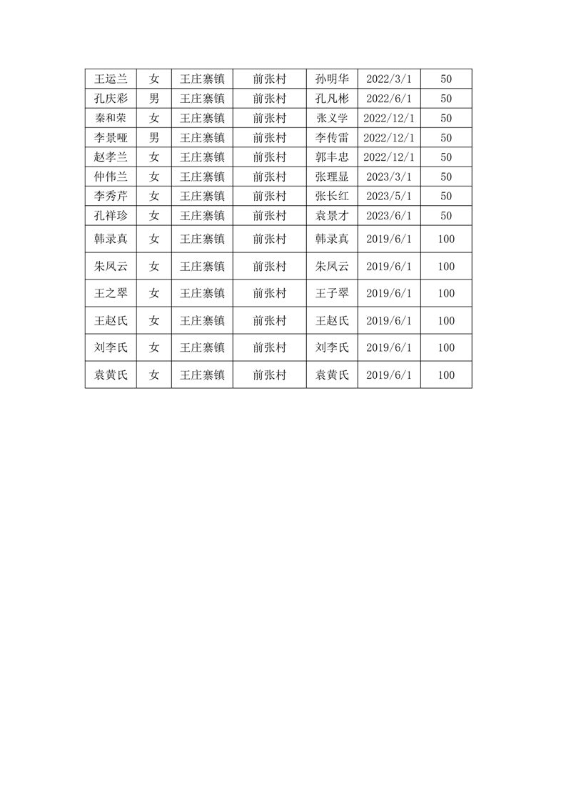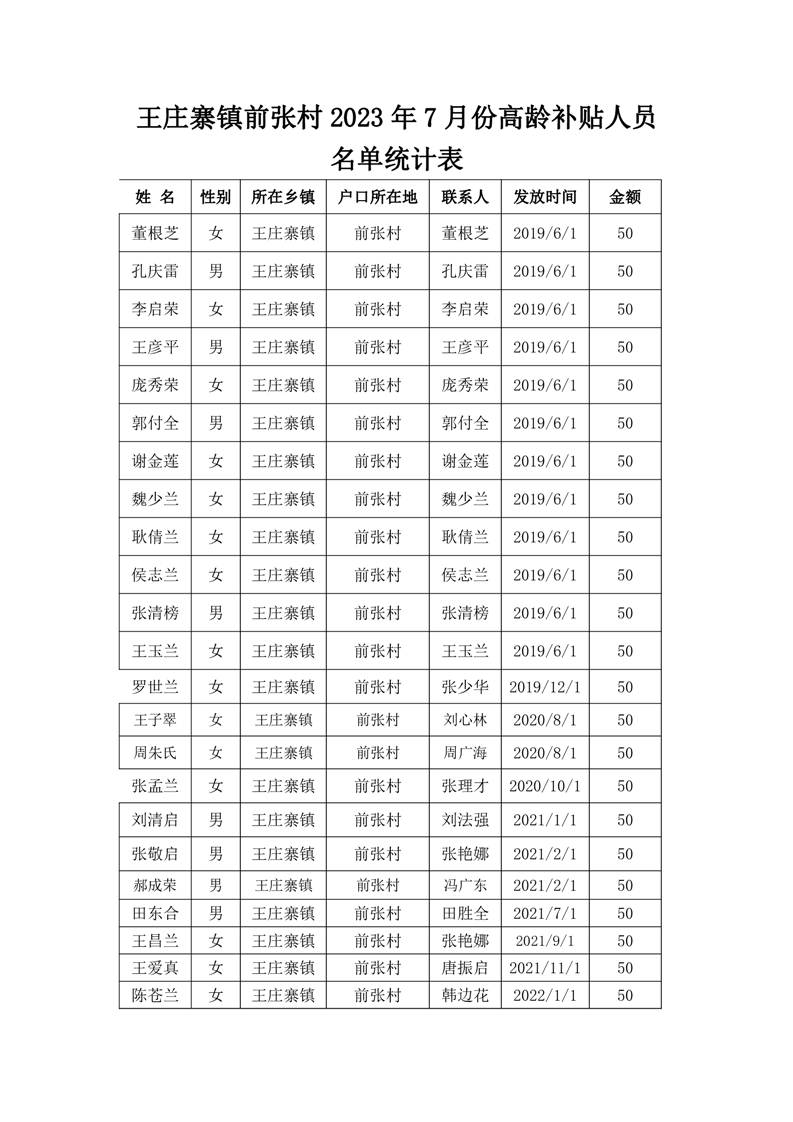 王庄寨镇前张村2023年7月份高龄补贴人员名单统计表