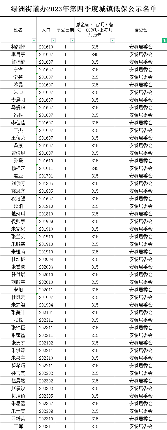 绿洲街道办2023年第四季度城镇低保公示名单