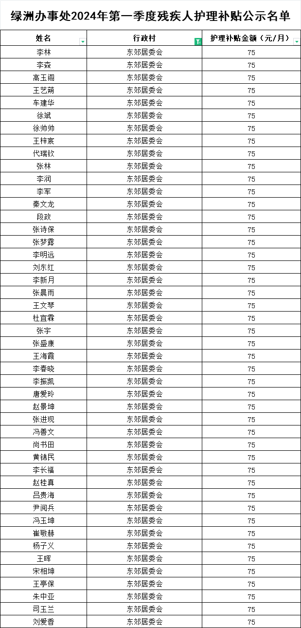 绿洲办事处2024年第一季度残疾人护理补贴公示名单