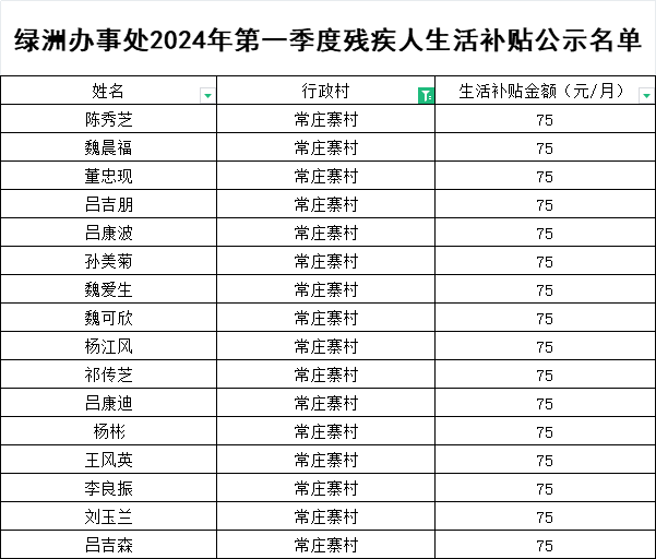 绿洲办事处2024年第一季度残疾人生活补贴公示名单