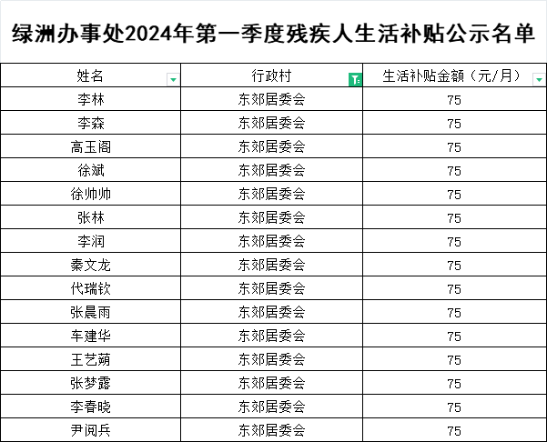 绿洲办事处2024年第一季度残疾人生活补贴公示名单