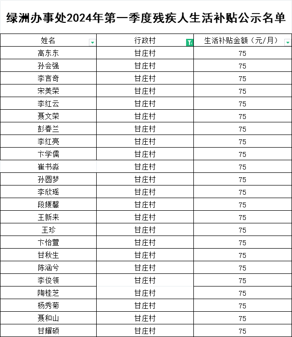绿洲办事处2024年第一季度残疾人生活补贴公示名单