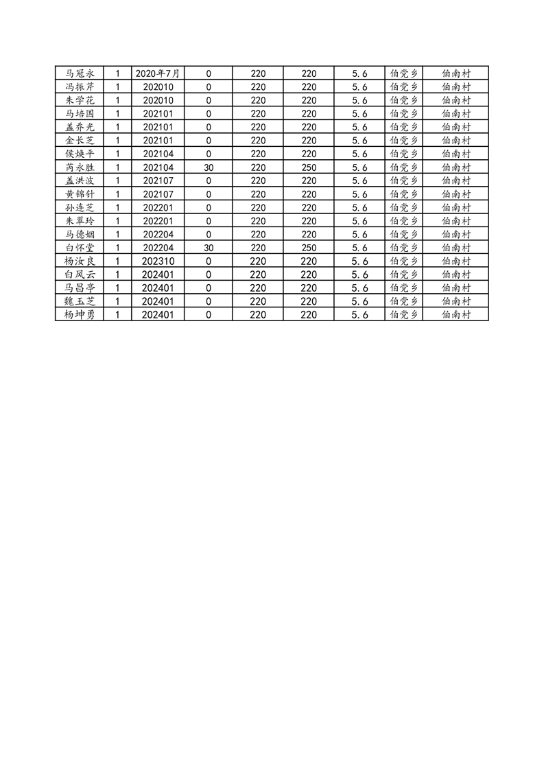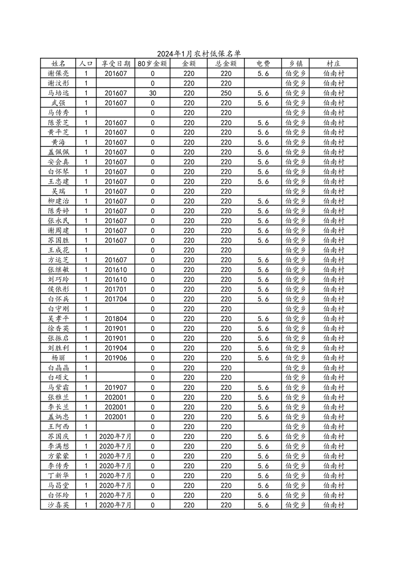 伯党乡伯南村2024年1月份农村低保人员名单