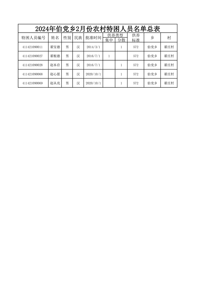 伯党乡翟庄村2024年2月份农村五保人员名单