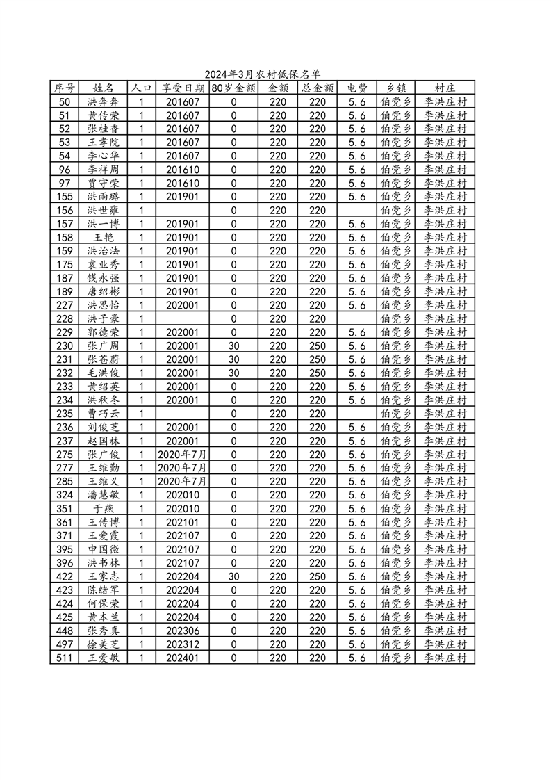 伯党乡李洪庄村2024年3月份农村低保人员名单
