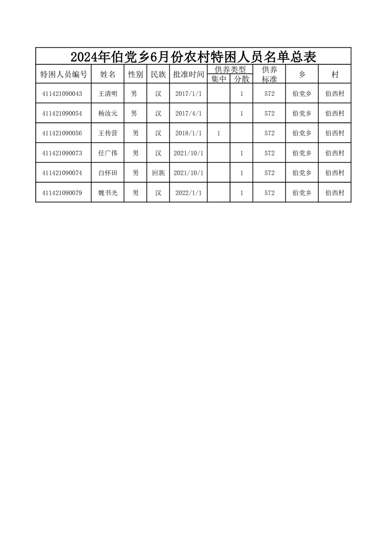 伯党乡伯西村2024年6月份农村五保人员名单